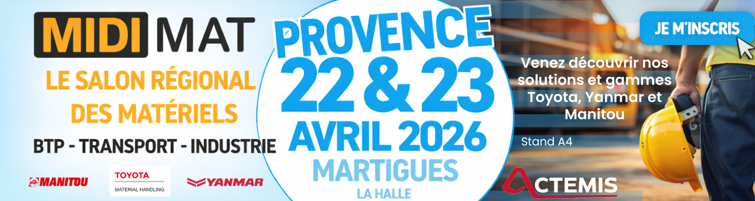 Les 22 et 23 avril, retrouvez Actemis Manutention au salon Midimat de Martigues, l’événement régional dédié aux professionnels de la construction, de l’industrie et de la manutention. Venez rencontrer nos équipes et découvrir nos solutions en conditions réelles !